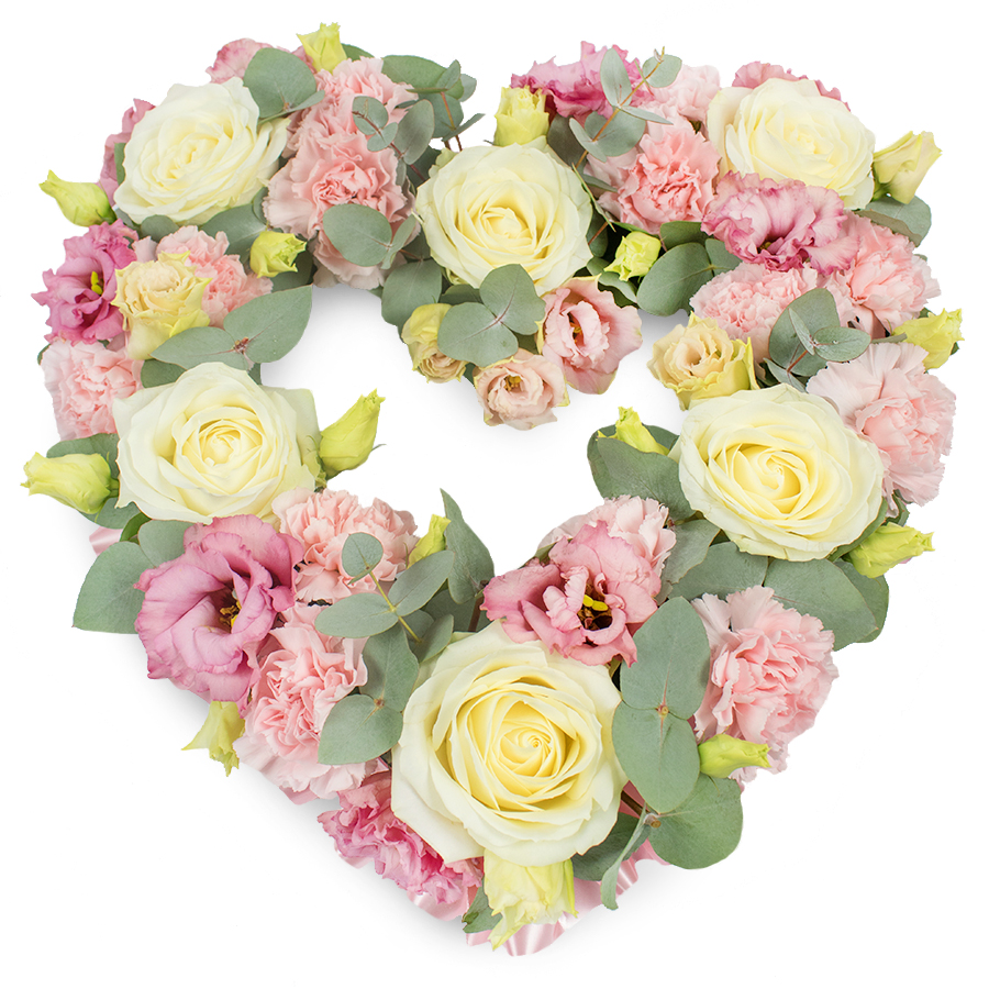 Express your deepest emotions with our Graceful Heart bouquet. This stunning arrangement showcases a blend of white roses, pink carnations, pink lisianthus, and eucalyptus leaves, artfully combined to create a visually appealing tribute.